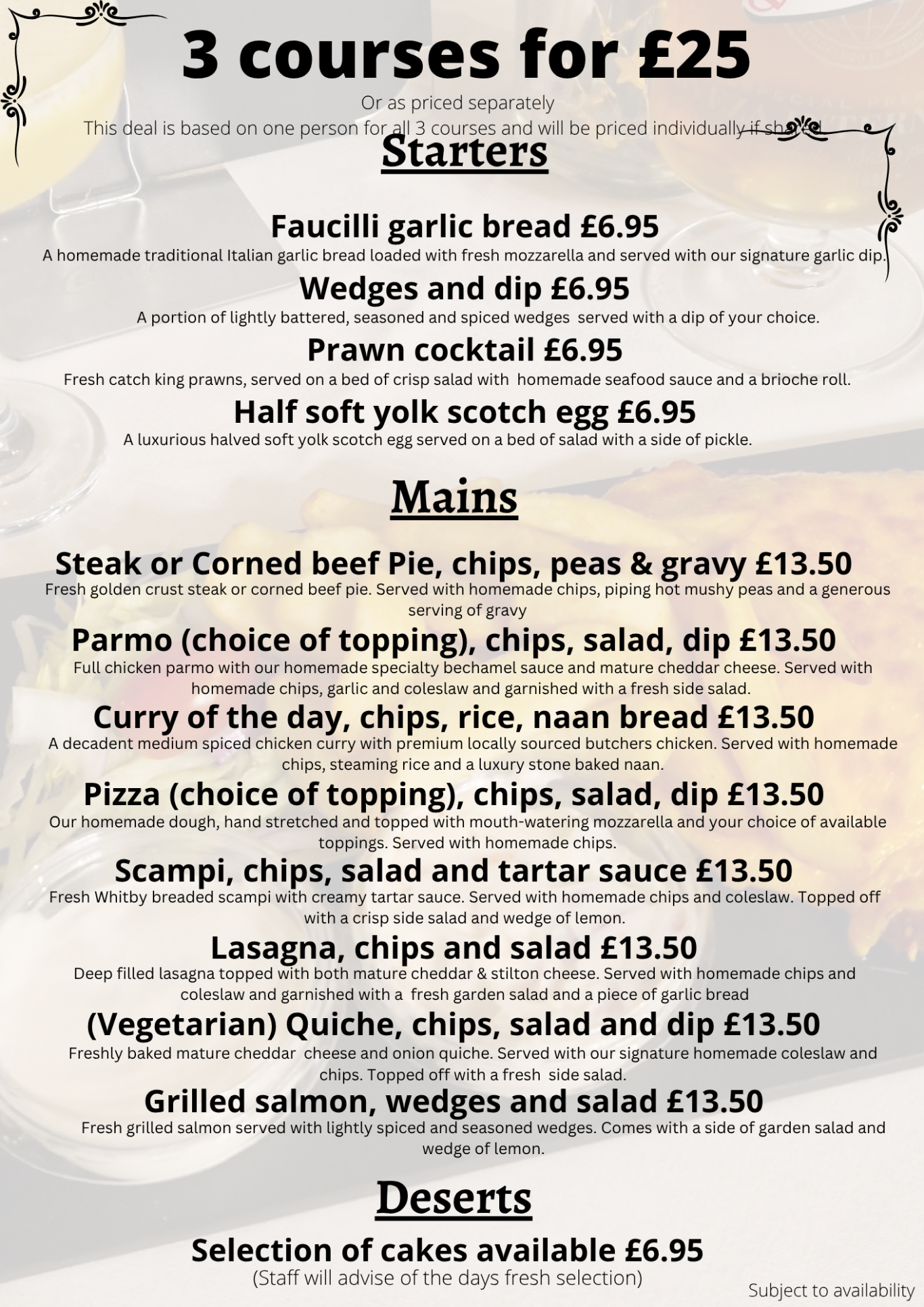 Our bistro bar offers 3 course meals at just £25pp. Or mains for just £13.50.