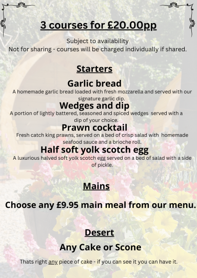 This year we are offering a 3 course meal for just £20 per person in our tea room or evening bistro bar. (booking essential for bistro bar and recommended for our tea room).